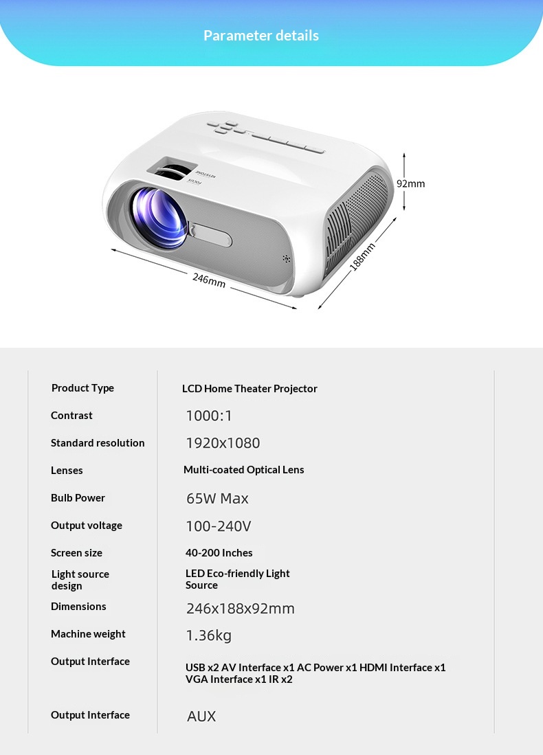 Projector * 1 + power cable * 1 + remote control * 1 + manual * 1 + packaging box * 1 Product image: